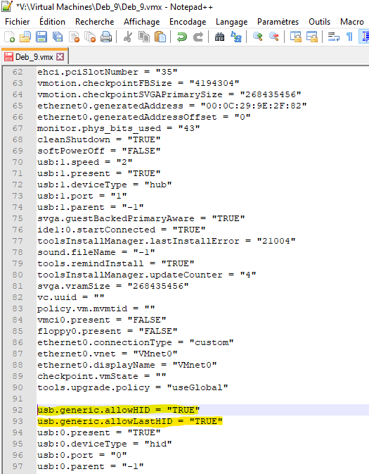 Éteindre la machine virtuelle et ajouter les directives suivantes dans le fichier de configuration de la machine machine se trouvant dans le répertoire contenant les machines virtuelles sur la machine et portant le suffixe .vmx :