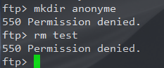 En essayant de supprimer le fichier text ou de créer un dossier dans le répertoire partagé, nous rencontrons une erreur 550 Permission denied car ces droits n’ont pas été attribués à l’utilisateur anonymous