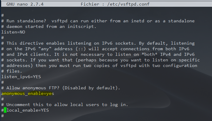 Une fois le paquet installé, nous allons éditer le fichier de configuration /etc/vsftp.conf pour procéder à la configuration du serveur :