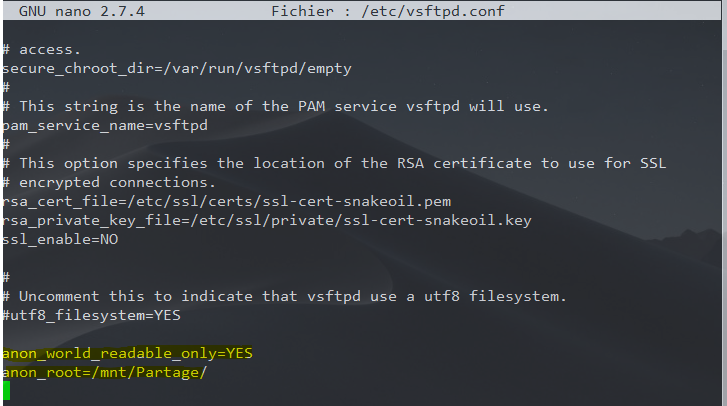Ici, le dossier qui va contenir les ressources partagées et accessibles aux utilisateurs anonymes est /mnt/Partage
