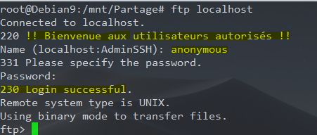 Nous remarquons que le client FTP s’est bien connecté au serveur et que la bannière qui a été définie pendant la configuration du serveur s’affiche bien