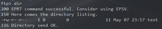 Une fois connecté, la commande dir nous permet de lister les différents fichiers présents dans le dossier partagé et on retrouve bien notre fichier text qui a été crée auparavant dans le dossier partagé