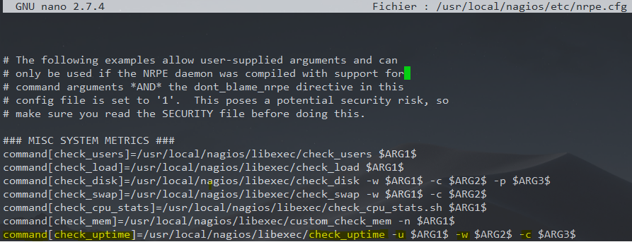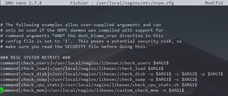Dans le fichier de configuration principale du serveur NRPE, on va définir les commandes qui vont servir à exécuter les différents scripts du répertoire /usr/local/nagios/libexec/