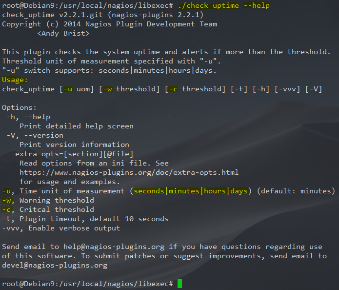 En exécutant la commande ./nom_script –help en ligne de commande dans le répertoire des scripts /usr/local/nagios/libexec/, nous avons une indication sur la façon dont un script doit être utilisé, comment et quels arguments peut-on lui passer.