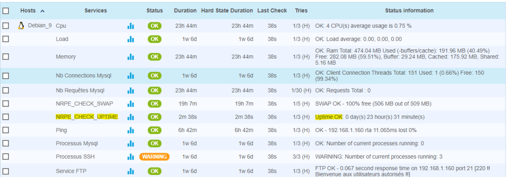 Résultats de la supervision sur l’interface web de centreon