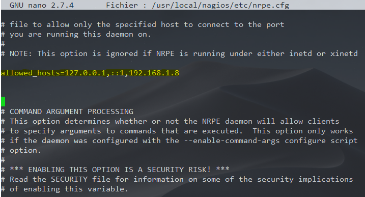 Une fois l’installation de NRPE et des scripts de supervision côté machine linux à superviser terminée, nous allons procéder à sa configuration dans le fichier / usr/local/nagios/etc/nrpe.cfg.La directive allowed_hosts permet d’indiquer les adresses IP des serveurs de supervision autorisés à requêter des informations concernant la machine Linux dans le but de la superviser.