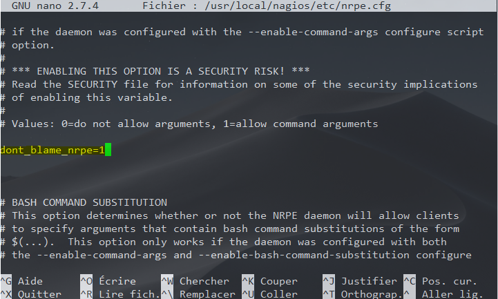 La directive dont_blame_nrpe avec une valeur 1 permet d’autoriser le passage d’arguments pour l’éxécution des commandes depuis le serveur de supervision.
